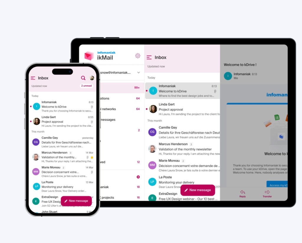 Zwitserse professionele e-mailservice met AI-aangedreven functies, onbeperkte opslag en uitgebreide business productiviteitstools van werknemers-eigendom Infomaniak.